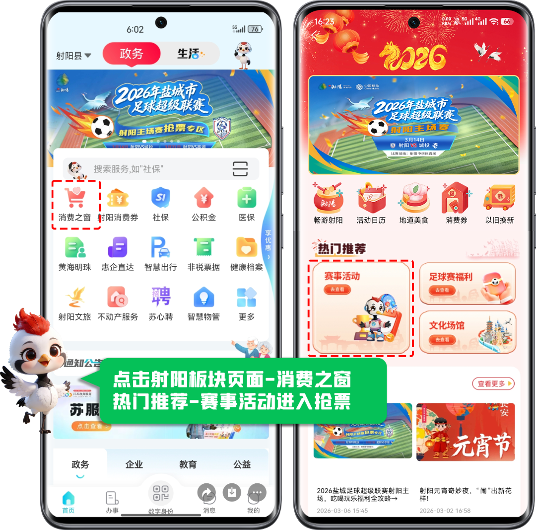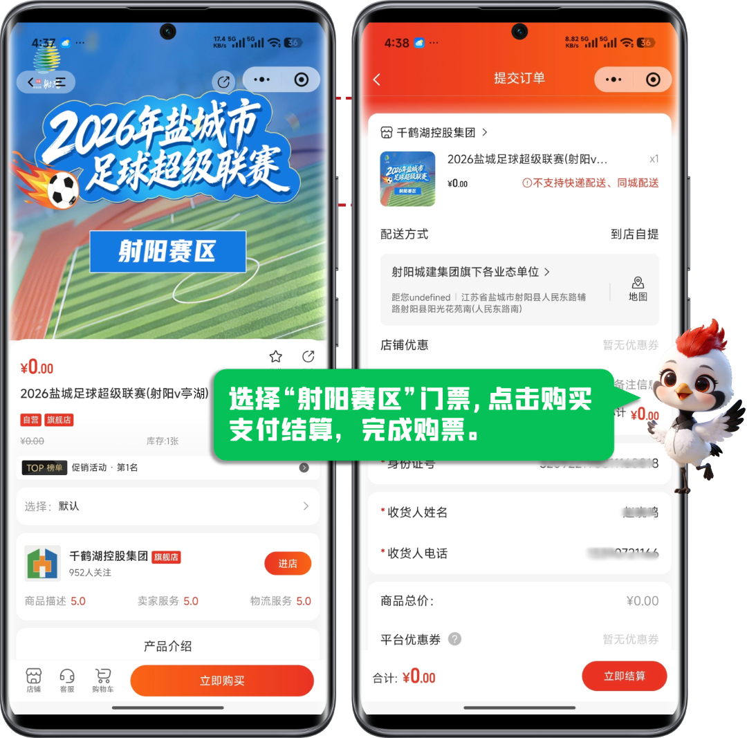 3月14日2026年盐城市足球超级联赛已经火热开赛啦~小组赛第三轮3月21日射阳队主场对阵亭湖队即将开票本次抢票分为四轮次3月16日-3月19日每天上午10:00在“我的盐城”APP开抢(2)登录“我的盐城”APP ,进入射阳板块→消费之窗→赛事活动(如图所示);(3)点击足球赛抢票进入抢票页面,选择足球联赛射阳主场门票链接;(4)点击购买,支付结算完成购票...